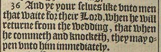 36 And ye your selues like vnto men that waite for their Lord, when he will returne from the wedding, that when he commeth and knocketh, they may open vnto him immediately.