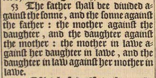 53 The father shall bee diuided against the sonne, and the sonne against the father: the mother against the daughter, and the daughter against the mother: the mother in lawe against her daughter in lawe, and the daughter in law against her mother in lawe.