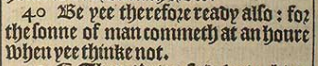 40 Be yee therefore ready also: for the sonne of man commeth at an houre when yee thinke not.
