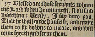37 Blessed are those seruants, whom the Lord when he commeth, shall find watching: Uerily, I say vnto you, That he shall girde himselfe, and make them to sit downe to meate, and will come foorth and serue them.