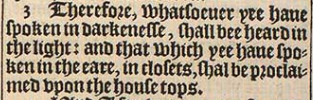 3 Therefore, whatsoeuer yee haue spoken in darkenesse, shall bee heard in the light: and that which yee haue spoken in the eare, in closets, shal be proclaimed vpon the house tops.