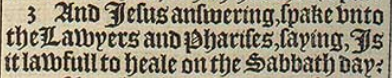 3 And Iesus answering, spake vnto the Lawyers and Pharises, saying, Is it lawfull to heale on the Sabbath day?