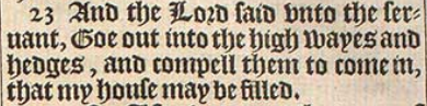23 And the Lord said vnto the seruant, Goe out into the high wayes and hedges, and compell them to come in, that my house may be filled.