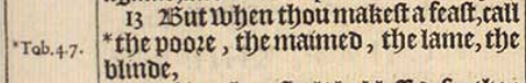13 But when thou makest a feast, call *the poore, the maimed, the lame, the blinde,[*Tob.4.7.]