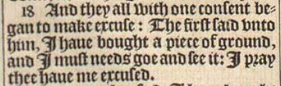 18 And they all with one consent began to make excuse: The first said vnto him, I haue bought a piece of ground, and I must needs goe and see it: I pray thee haue me excused.