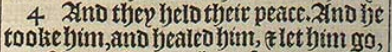 4 And they held their peace. And he tooke him, and healed him, & let him go,