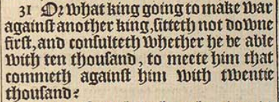 31 Or what king going to make war against another king, sitteth not downe first, and consulteth whether he be able with ten thousand, to meete him that commeth against him with twentie thousand?