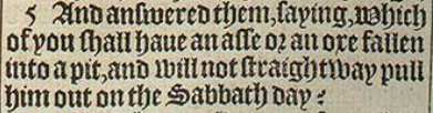 5 And answered them, saying, Which of you shall haue an asse or an oxe fallen into a pit, and will not straightway pull him out on the Sabbath day?