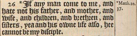 26 *If any man come to me, and hate not his father, and mother, and wife, and children, and brethren, and sisters, yea and his owne life also, hee cannot be my disciple.[*Matth. 10.37.]