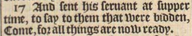17 And sent his seruant at supper time, to say to them that were bidden, Come, for all things are now ready.