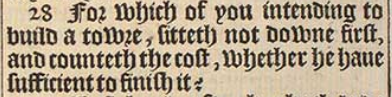 28 For which of you intending to build a towre, sitteth not downe first, and counteth the cost, whether he haue sufficient to finish it?