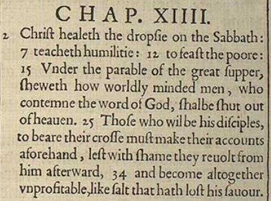 2 Christ healeth the dropsie on the Sabbath: 7 teacheth humilitie: 12 to feast the poore: 15 Vnder the parable of the great supper, sheweth how worldly minded men, who contemne the word of God, shalbe shut out of heauen. 25 Those who wil be his disciples, to beare their crosse must make their accounts aforehand, lest with shame they reuolt from him afterward, 34 and become altogether vnprofitable, like salt that hath lost his sauour.