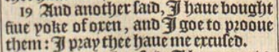 19 And another said, I haue bought fiue yoke of oxen, and I goe to prooue them: I pray thee haue me excused.