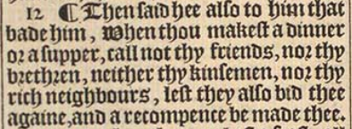 12 ¶ Then said hee also to him that bade him, When thou makest a dinner or a supper, call not thy friends, nor thy brethren, neither thy kinsemen, nor thy rich neighbours, lest they also bid thee againe, and a recompence be made thee.