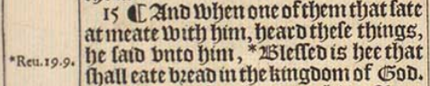 15 ¶ And when one of them that sate at meate with him, heard these things, he said vnto him, *Blessed is hee that shall eate bread in the kingdom of God.[*Reu. 19.9.]