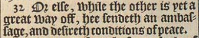 32 Or else, while the other is yet a great way off, hee sendeth an ambassage, and desireth conditions of peace.