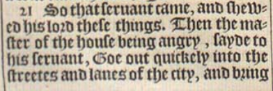 21 So that seruant came, and shewed his lord these things. Then the master of the house being angry, sayde to his seruant, Goe out quickely into the streetes and lanes of the city, and bring in hither the poore, and the maimed, and the halt, and the blinde.