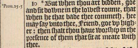 10 *But when thou art bidden, goe and sit downe in the lowest roume, that when he that bade thee commeth, hee may say vnto thee, Friend, goe vp higher: then shalt thou haue worship in the presence of them that sit at meate with thee.[*Prou. 25.5]