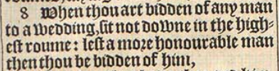 8 When thou art bidden of any man to a wedding, sit not downe in the highest roume: lest a more honourable man then thou be bidden of him,