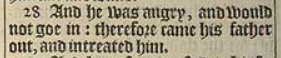 28 And he was angry, and would not goe in: therefore came his father out, and intreated him.