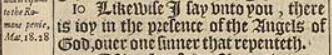 10 Likewise I say vnto you, there is ioy in the presence of the Angels of God, ouer one sinner that repenteth.”