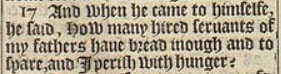 17 And when he came to himselfe, he said, How many hired seruants of my fathers haue bread inough and to spare, and I perish with hunger?