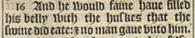 16 And he would faine haue filled his belly with the huskes that the swine did eate: & no man gaue vnto him.