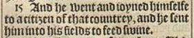 15 And he went and ioyned himselfe to a citizen of that countrey, and he sent him into his fields to feed swine.