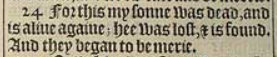 24 For this my sonne was dead, and is aliue againe; hee was lost, & is found. And they began to be merie.