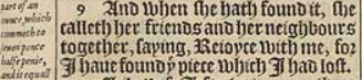 9 And when she hath found it, she calleth her friends and her neighbours together, saying, Reioyce with me, for I haue found þe piece which I had lost.