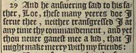 29 And he answering said to his father, Loe, these many yeeres doe I serue thee, neither transgressed I at any time thy commandement, and yet thou neuer gauest mee a kid, that I might make merry with my friends: