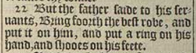 22 But the father saide to his seruants, Bring foorth the best robe, and put it on him, and put a ring on his hand, and shooes on his feete.