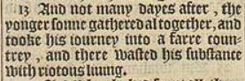 13 And not many dayes after, the yonger sonne gathered al together, and tooke his iourney into a farre countrey, and there wasted his substance with riotous liuing.
