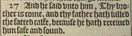 27 And he said vnto him, Thy brother is come, and thy father hath killed the fatted calfe, because he hath receiued him safe and sound.