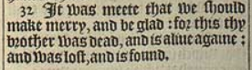32 It was meete that we should make merry, and be glad: for this thy brother was dead, and is aliue againe: and was lost, and is found.