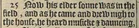 25 Now his elder sonne was in the field, and as he came and drew nigh to the house, he heard musicke & dauncing,