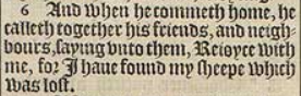 6 And when he commeth home, he calleth together his friends, and neighbours, saying vnto them, Reioyce with me, for I haue found my sheepe which was lost.