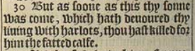 30 But as soone as this thy sonne was come, which hath deuoured thy liuing with harlots, thou hast killed for him the fatted calfe.