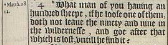 4 *What man of you hauing an hundred sheepe, if he loose one of them, doth not leaue the ninety and nine in the wildernesse, and goe after that which is lost, vntill he find it?[*Matth. 18 12.]