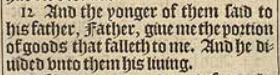 12 And the yonger of them said to his father, Father, giue me the portion of goods that falleth to me. And he diuided vnto them his liuing.