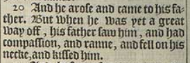 20 And he arose and came to his father. But when he was yet a great way off, his father saw him, and had compassion, and ranne, and fell on his necke, and kissed him.