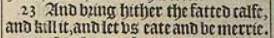 23 And bring hither the fatted calfe, and kill it, and let vs eate and be merrie.