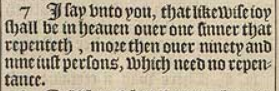 7 I say vnto you, that likewise ioy shall be in heauen ouer one sinner that repenteth, more then ouer ninety and nine iust persons, which need no repentance.