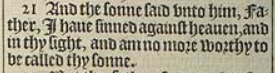 21 And the sonne said vnto him, Father, I haue sinned against heauen, and in thy sight, and am no more worthy to be called thy sonne.