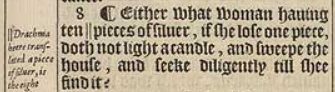 8 ¶ Either what woman hauing ten || pieces of siluer, if she lose one piece, doth not light a candle, and sweepe the house, and seeke diligently till shee find it? [|| Drachma heere translated a piece of silver, is the eight part of an ounce which commeth to seven pence halfe penie, and is equall to the Romane penie, Mat. 18. 28]