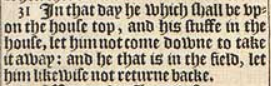 31 In that day he which shall be vpon the house top, and his stuffe in the house, let him not come downe to take it away: and he that is in the field, let him likewise not returne backe.