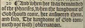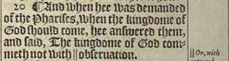 20 ¶ And when hee was demanded of the Pharises, when the kingdome of God should come, hee answered them, and said, The kingdome of God commeth not with || obseruation.[|| Or, with outward shew.]