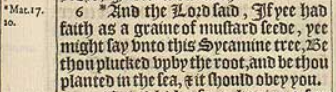 6 *And the Lord said, If yee had faith as a graine of mustard seede, yee might say vnto this Sycamine tree, Be thou plucked vp by the root, and be thou planted in the sea, & it should obey you.[*Mat. 17. 20.]