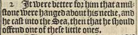 2 It were better for him that a milstone were hanged about his necke, and he cast into the Sea, then that he should offend one of these little ones.