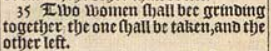 35 Two women shall bee grinding together; the one shall be taken, and the other left.